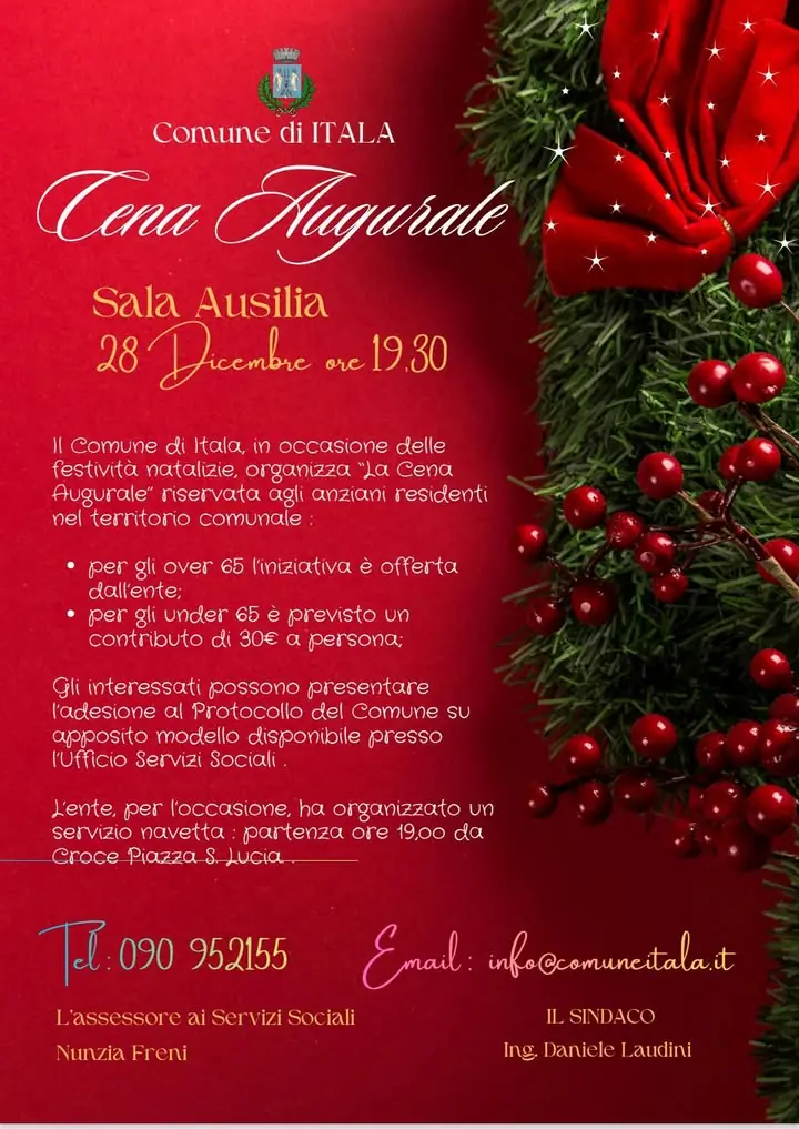 🎉🥂 Cena Augurale del Comune di Itala🎄✨ 🏛️Il Comune di Itala vi invita a festeggiare insieme con la tradizionale "Cena Augurale", dedicata ai nostri anziani residenti nel comune di Itala! Dettagli dell'Evento: 🗓️Domenica 28 Dicembre 2025 🕡Ore 19:30 👨🍳Presso Sala Ausilia ✍️ Modalità di Adesione Modul